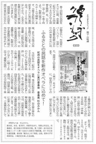 とらふすクラシック・322。ふるさとの民話を新作オペラに込めて! 紀州の民話をオペラに実行委員会 委員長 杉山みかん第7回紀州の民話をオペラに公演、音楽劇「紀州のタヌキと四国のキツネのとんでも国替え物語」を、11月3日(金・祝)午後2時より、…