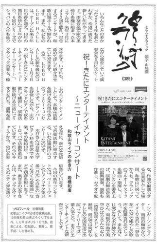 わかやま新報 とらふすクラシック・385 祝!きたにエンターテイメント ~ニューイヤーコンサート いろんなことの多かった2024年もあとわずか、希望に満ちた新しい年がやってきます。南葵音楽文庫の里がえりを機に始まった本コラムは、来年3月に40…